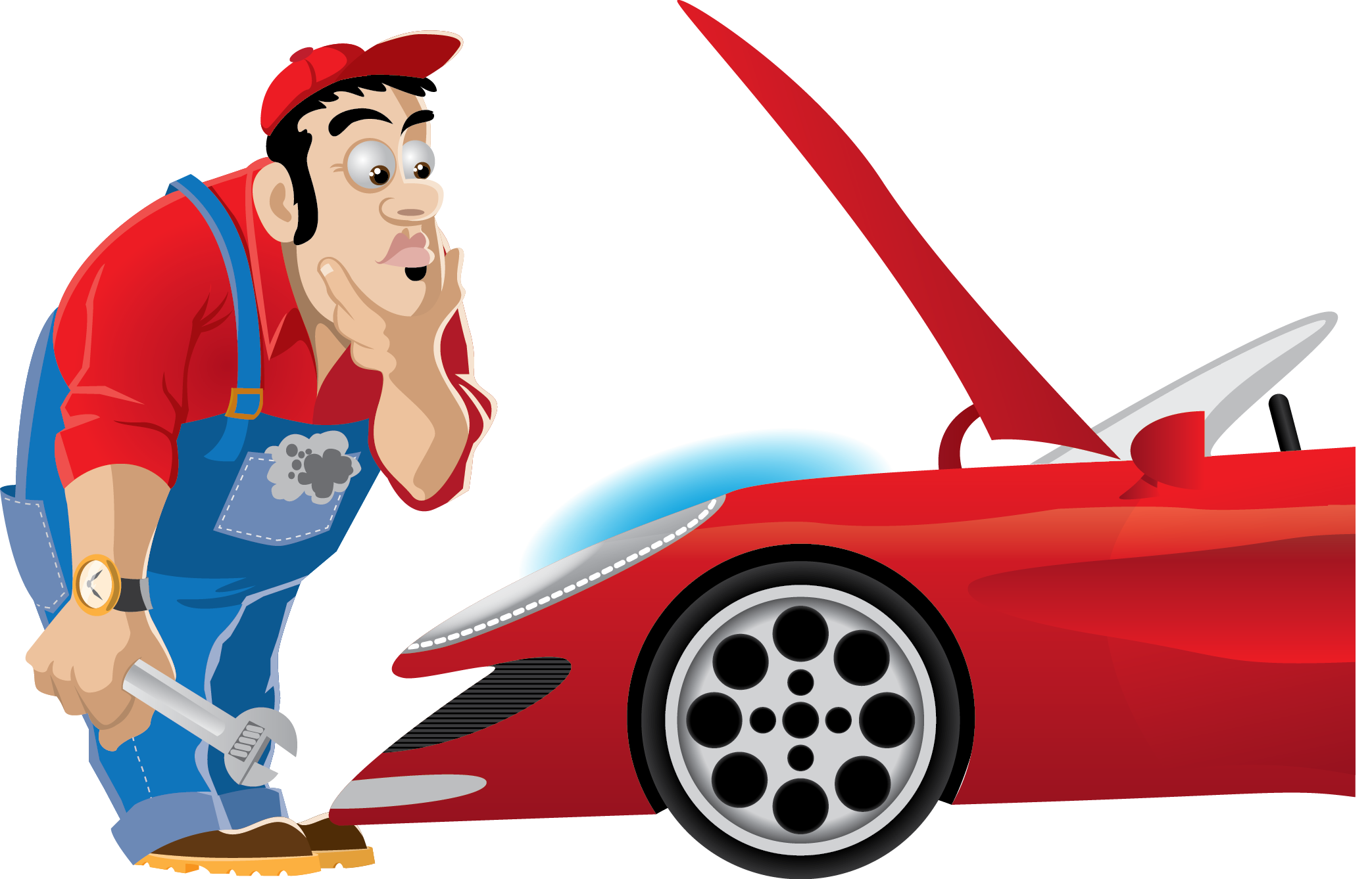 مهندس مکانیک تپل کارتونی در حال فکر کردن جلوی ماشین قرمز png