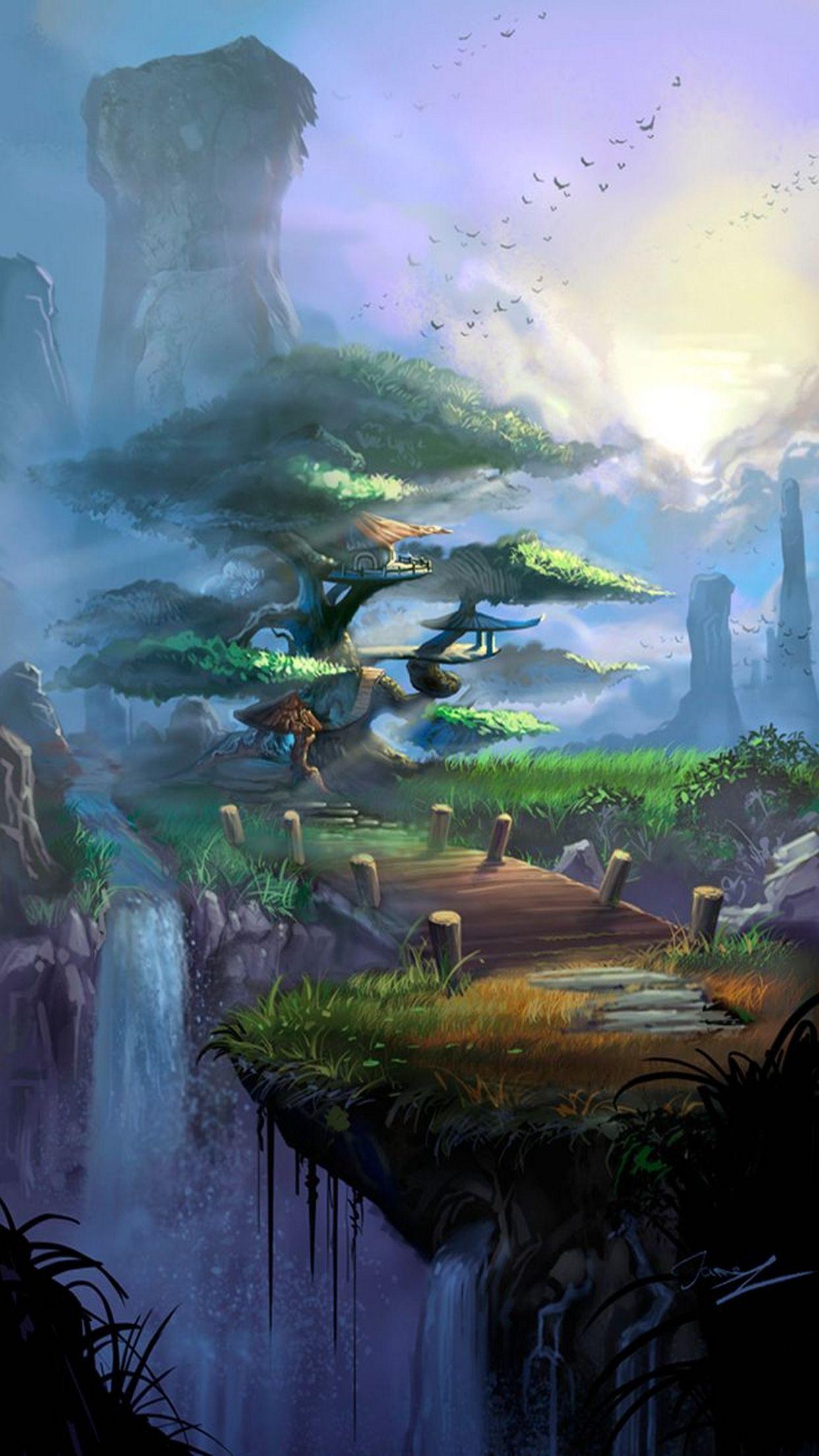 پس زمینه نقاشی رنگ روغن منظره شاداب و پرطراوت آبشار