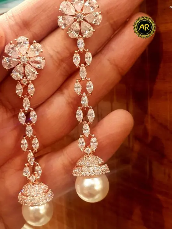 گوشواره شیک با الماس های عالی، این گوشواره بلند همه ویژگی های یک گوشواره مجلسی را دارد. وجود سنگهای گران قیمت الماس با تعداد زیاد و مروراید آن را در خانواده جواهرهای سلطنتی قرار داده است. گوشواره ایی کلاسیک و فوق العاده که درخشش و گیرای آن را در عکس می توانید ببینید. این مدل در بخش گالری جواهرها هم از محبوب ترین گوشواره بین ثروتمندان جهان است.